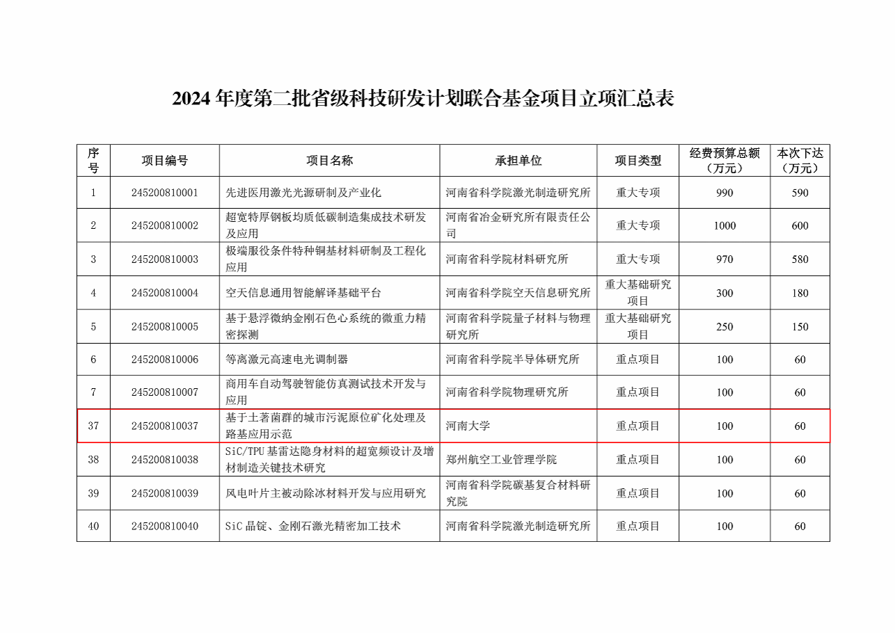 近日,河南省科学技术厅正式发布2024年度第二批省级科技研发计划联合基金项目立项名单。由学院副院长原华教授牵头申报的“基于土著菌群的城市污泥原位矿化处理及路基应用示范”项目经过多轮严格评审,最终成功获批立项。